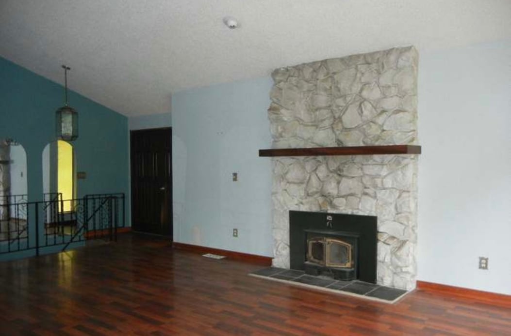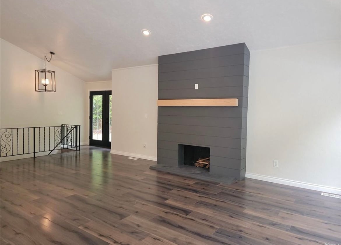 Fireplace before and after, along with new flooring, front door, paint, and lighting.